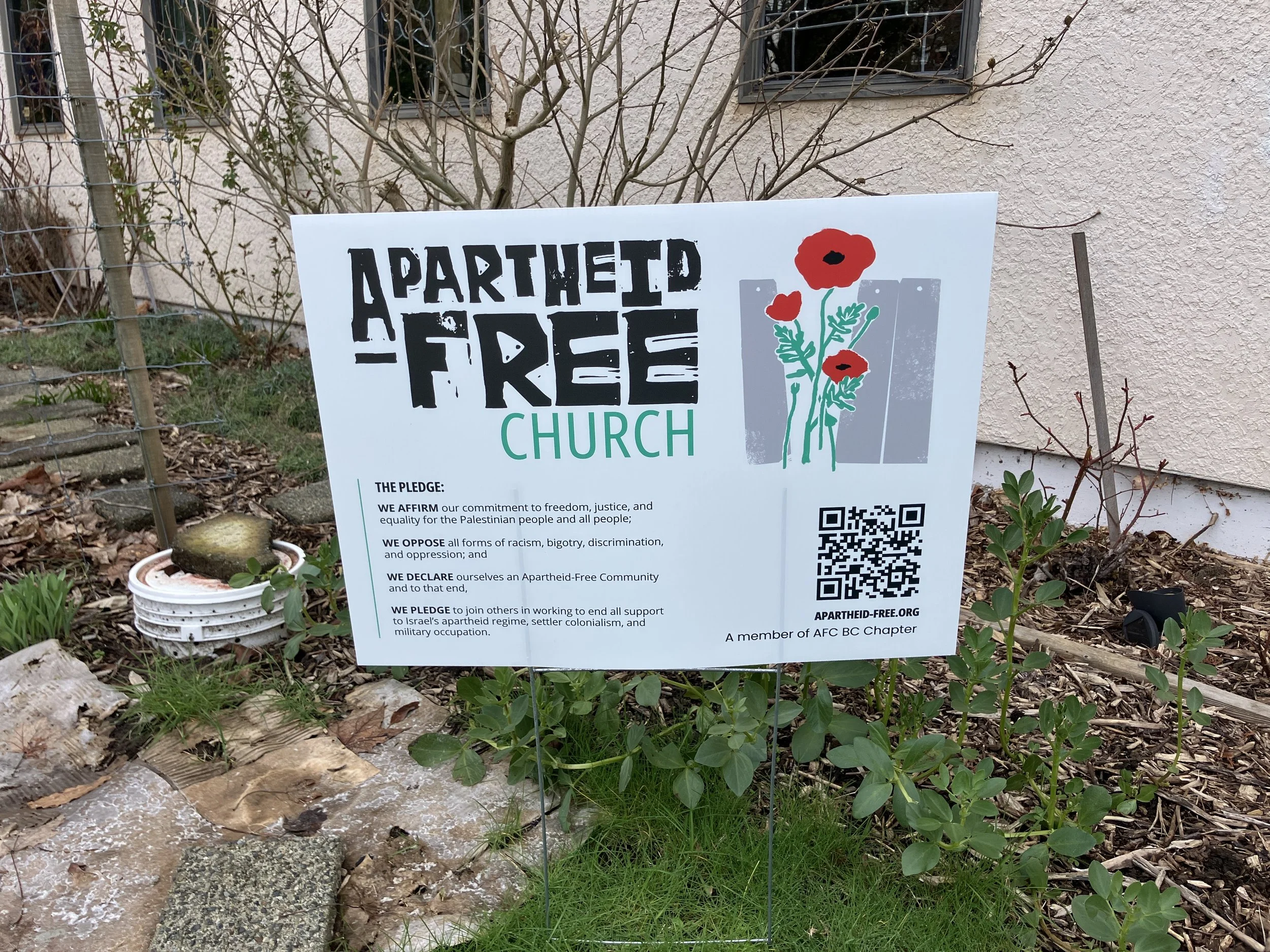 Between Saturday, February 8th, and Sunday, February 9th, an Apartheid-Free Church yard sign was spray-painted with a swastika.