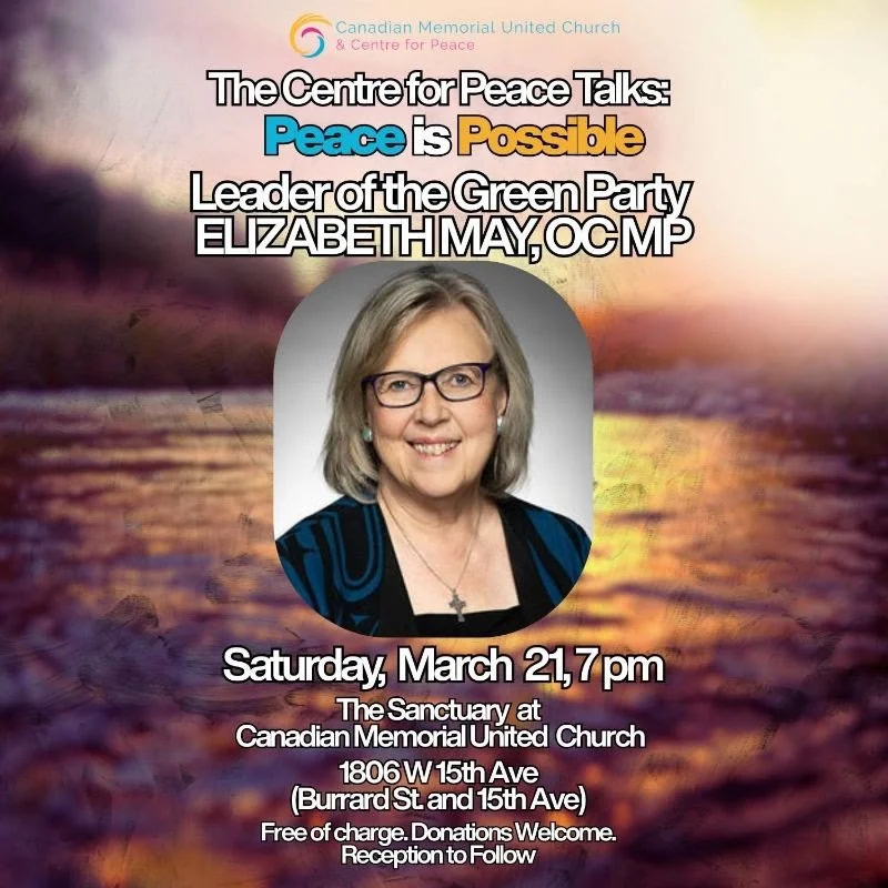 Canadian Memorial United Church warmly invites the wider community to the next instalment of The Centre for Peace Talks with Federal Green Party leader, Elizabeth May, OC MP.
