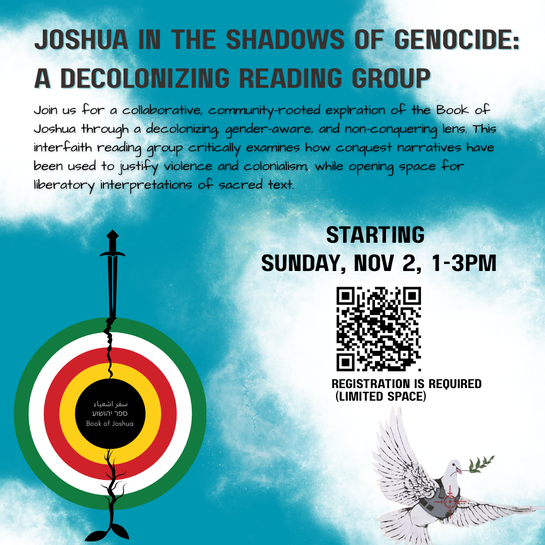 Join us for a collaborative, community-rooted exploration of the Book of Joshua through a decolonizing, gender-aware, and non-conquering lens. This interfaith reading group critically examines how conquest narratives have been used to justify violence and colonialism, while opening space for liberatory interpretations of sacred text.