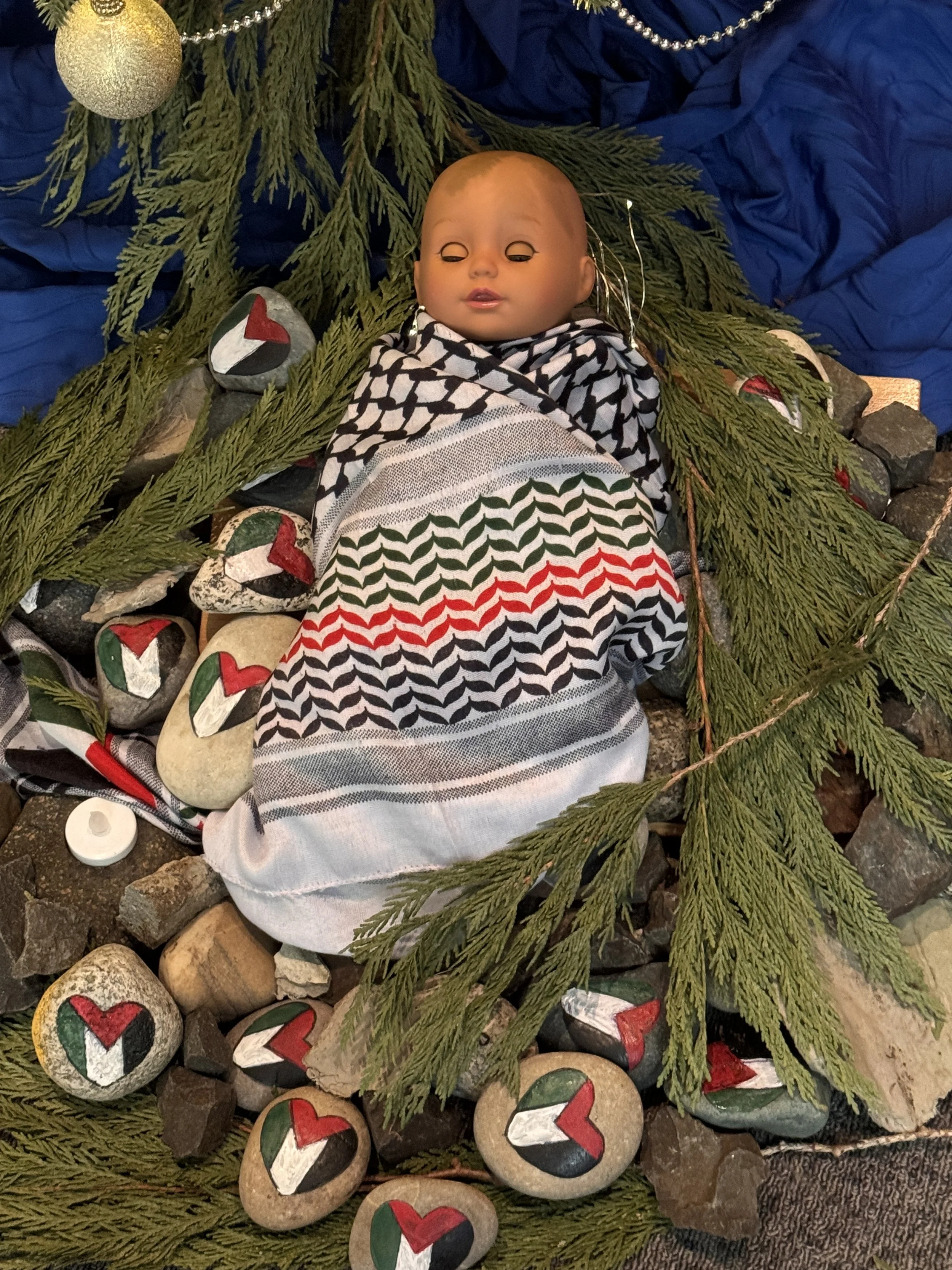 The Evangelical Christmas Church in Bethlehem, led by Rev. Munther Isaac, created this powerful "Christ in the Rubble" nativity scene in December 2023 that has since become a global symbol of resistance and hope. Instead of placing the Christ child in a traditional manger, Palestinians positioned the baby Jesus wrapped in a Kufiyeh [a traditional Palestinian headscarf, typically featuring black and white checkered patterns, that has become an enduring symbol of Palestinian identity and resistance], lying in a pile of rubble.